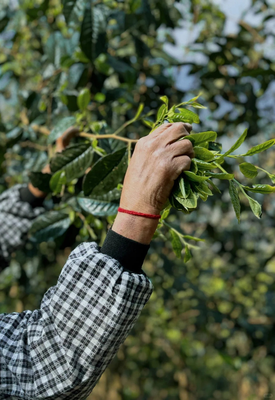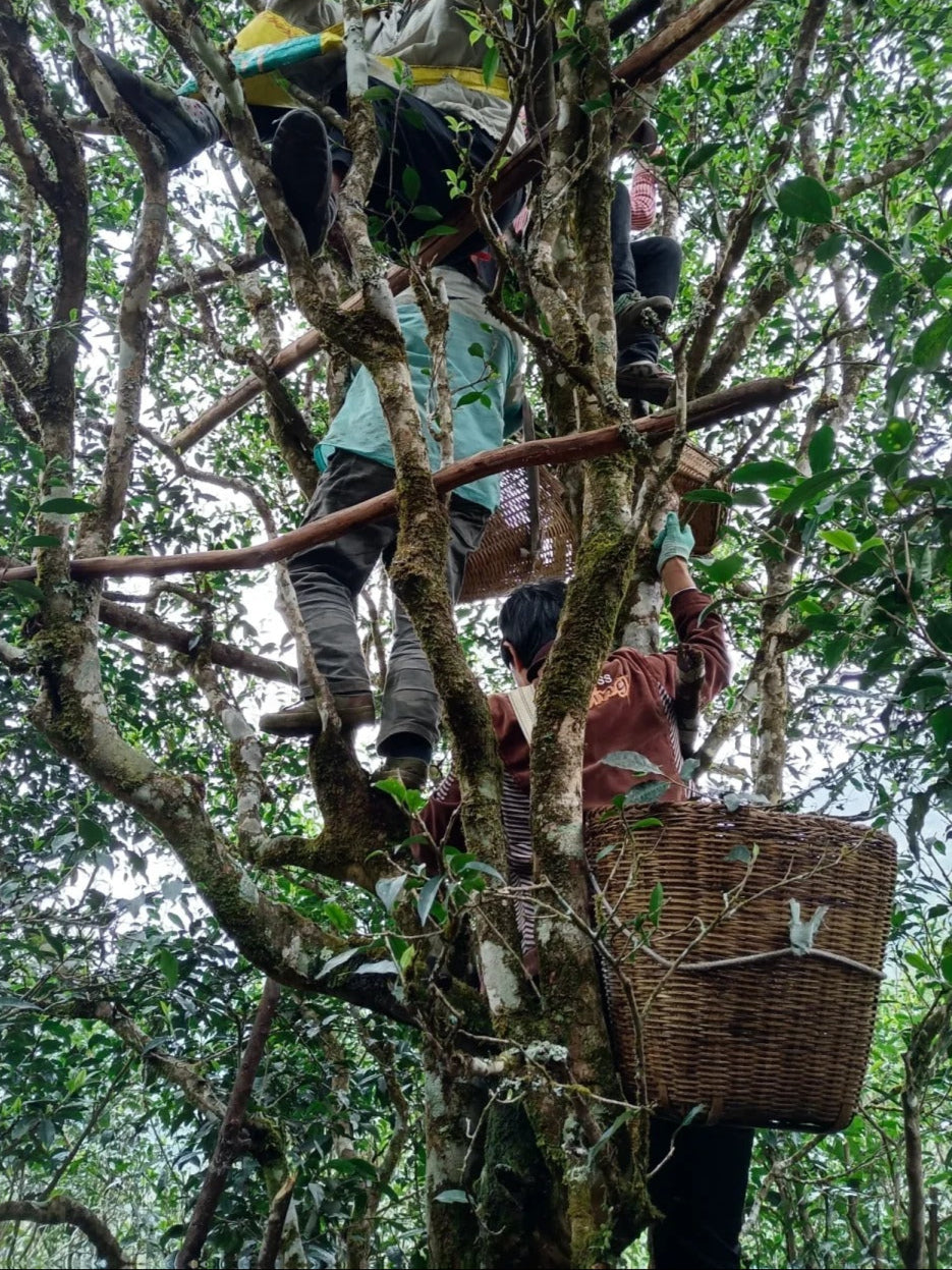 The older the tree, the taller and more spread out its branches become, requiring farmers to carefully climb and manually pick the leaves.